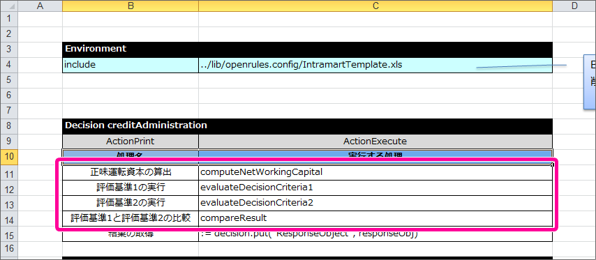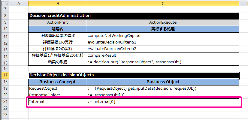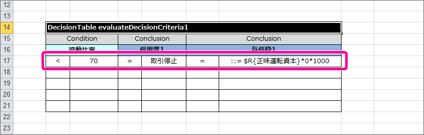編集中のExcelファイルの「DecisionTable」シートを表示してください。 テンプレートには、説明が添付されていますので、枠で囲まれた部分を削除してください。 テンプレートの DecisionTable をコピーして作成できるように、テーブルのヘッダの先頭に “//”を記述してください。 先ほどヘッダを変更した DecisionTable をコピーして、1列・1行以上空けて貼り付けてください。 テーブル名から、コメントアウトの”//”を削除し、 Decision で設定した名前(computeNetWorkingCapital)に変更してください。 設定する項目名(論理名)と式を以下のように設定してください。この DecisionTable では、1つの式を実行させる処理だけを記述しますので、式を書いたら残りの行は削除してください。項目同士の計算を行うには、 $R(getReal) を利用して式を書くようにしましょう。今回のハンズオンで使用する数値項目は、double型で定義するため、 $R(getReal) としています。int型の数値を扱う場合は、 $I(getInt) を利用してください。 これで正味運転資本を算出するための DecisionTable ができましたので、保存してください。続いて、評価基準1の処理を行う DecisionTable を作成しましょう。