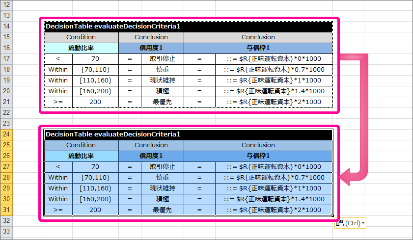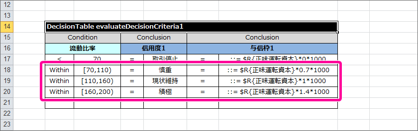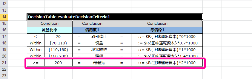 流動比率に基づいて、先ほど算出した正味運転資本から与信枠を計算し、信用度とともに返却する DecisionTable をまとめます。