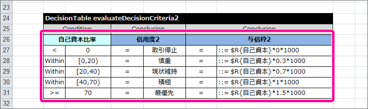 自己資本比率に基づいて、与信枠を計算し、信用度とともに返却する DecisionTable をまとめます。