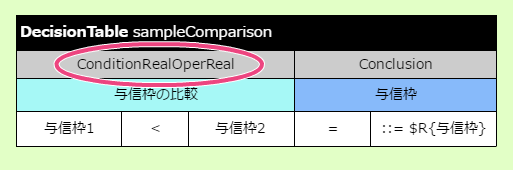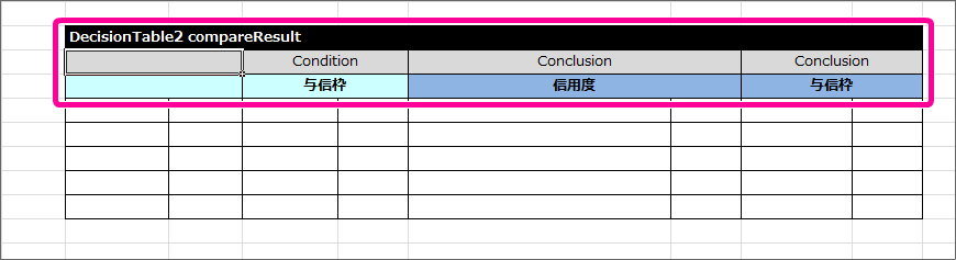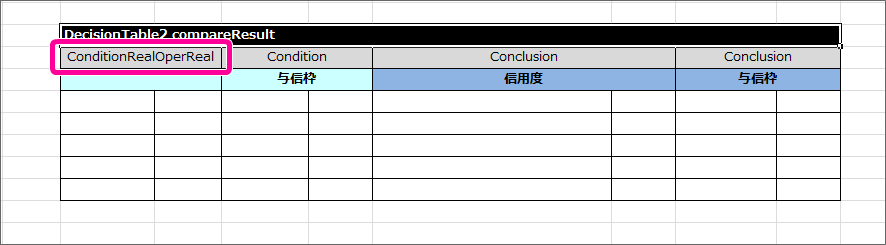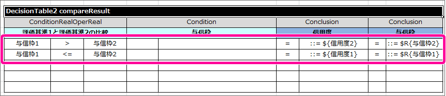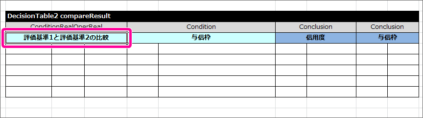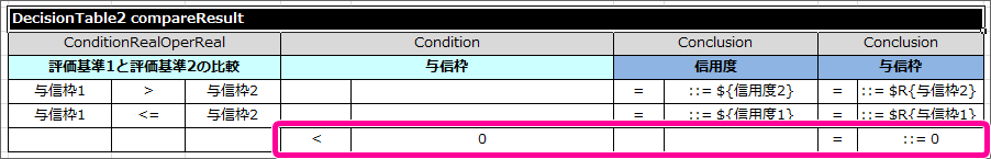 DecisionTable2 は、今までのハンズオンで作成してきた DecisionTable と処理方法が少し異なります。詳細については「 OpenRules のキーワードリファレンス 」で確認してください。 テーブル名を Decision で設定した名前(compareResult)に変更してください。また、サブヘッダや明細の内容を以下の内容に変更してください。このとき、1番左の列が空白となっている点と、 Condition と Conclusion に「与信枠」が2度登場している点については、後で説明していきますので、そのままにしておいてください。 最初に「評価基準1の実行」の結果と「評価基準2の実行」の結果を比較する条件を記述してください。項目同士の比較を条件に指定する場合には、 Condition ではなく専用のキーワードを利用します。今回の「与信枠1」「与信枠2」は、double型として扱うため、 ConditionRealOperReal と入力してください。 ConditionRealOperReal では、「左の比較対象の項目名」「演算子」「右の比較対象の項目名」という3つの項目で構成します。テーブルに1列挿入し、 ConditionRealOperReal の列が3つのセルとなるように設定してください。このとき、ヘッダから列がはみ出した場合には、セル結合を実行してすべての列がヘッダの列の範囲に含まれるようにしてください。 サブヘッダの内容には、 わかりやすくするために「評価基準1と評価基準2の比較」と入力してください。 条件について、「評価基準1の結果が大きい」パターンと「評価基準2の結果が同じか等しくなる」パターンに分けて条件を入力してください。結果については、 Conclusion を設定し、値が小さい方の評価基準の項目を設定するようにしてください。 最後に、比較した結果からセットした「与信枠」が負数の場合には0をセットするという処理を追加します。この処理を追加するために、条件( Condition )とした与信枠に「0未満」を表す条件を設定してください。 これで必要な DecisionTable をすべて作成しましたので、保存してください。