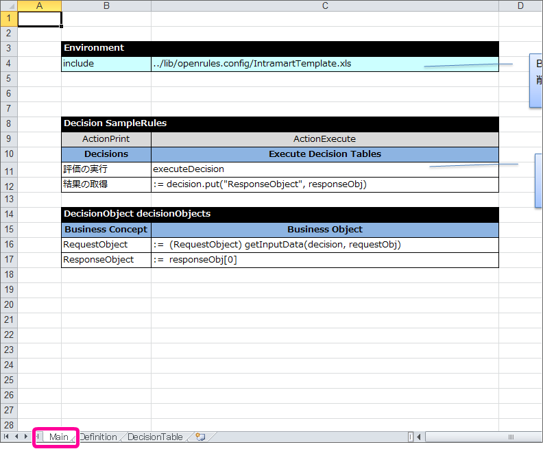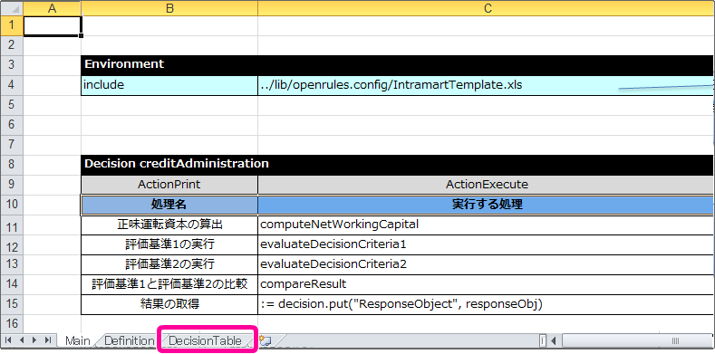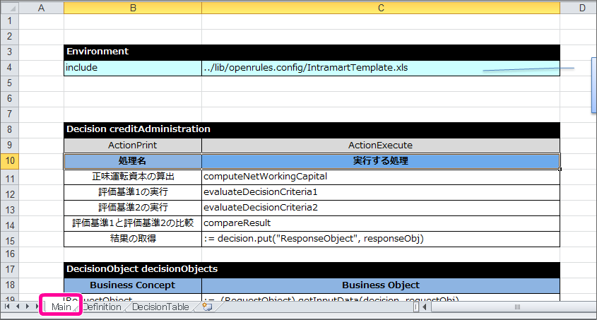 「Main」シートを表示してください。 「Main」シートで DecisionObject を設定していきます。入力項目、出力項目のオブジェクトについては、テンプレートと同じ設定となっているため、その下に内部項目のオブジェクト用に1行追加してください。 追加した行には、以下の通りに設定してください。 これで、 OpenRules で取引先の与信管理をするためにExcelのルール定義ファイルの設定が完了しましたので、ファイルを保存してください。IM-BIS の画面(フォーム)と連携するための設定を行っていきましょう。