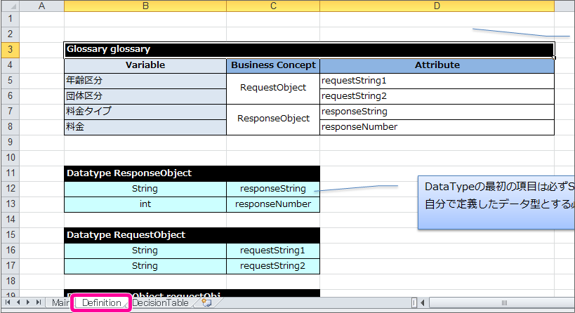 Glossary を作成するために、「Definition」シートを表示してください。 整理した項目と分類に基づいて、Glossary を作成していきますが、「入力項目のグループ」(RequestObject)については、すべて数値項目で構成されています。そのままRequestObjectを数値項目のみで定義すると OpenRules の制約事項に抵触するため、String項目として、「企業名」を追加して作成してください。 Glossary が作成できましたので、保存してください。