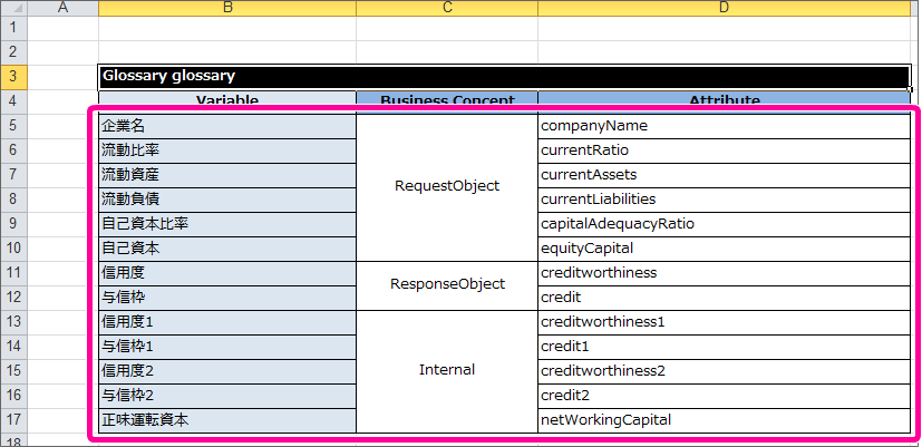 DecisionTable で使っている項目を確認しながら、 Glossary を定義していきましょう。