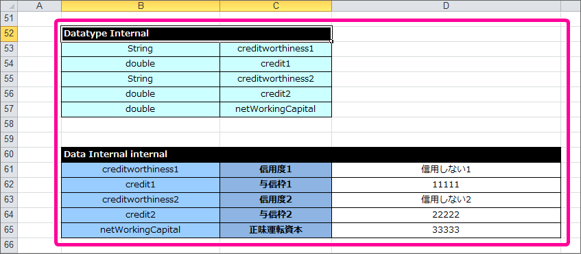 Data Internal internal creditworthiness1 信用度1 信用度初期値 creditworthiness2 信用度2 信用度初期値 credit1 与信枠1 0 credit2 与信枠2 0 netWorkingCapital 正味運転資本 0