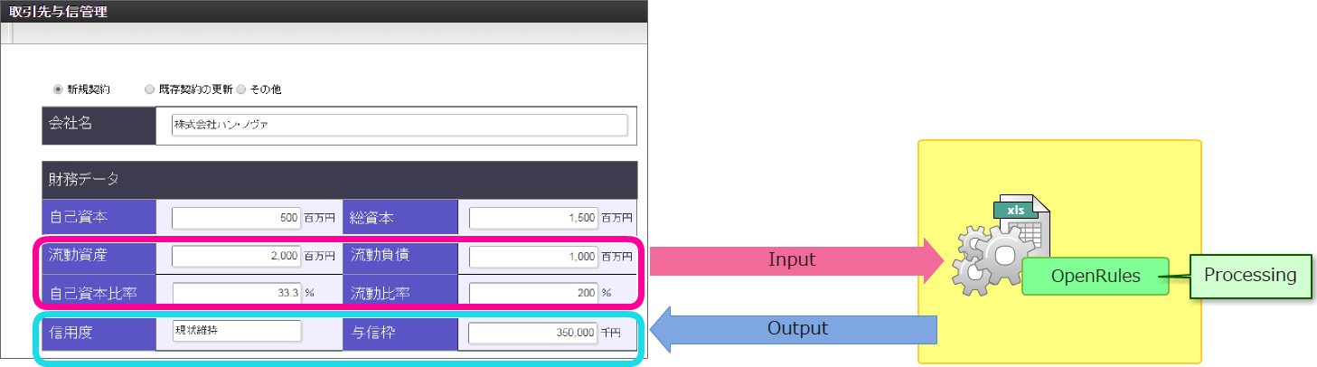 - 出力・・・入力で設定した与信枠と信用度の比較結果