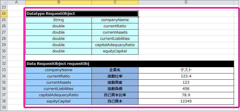 Data RequestObject requestObj companyName 企業名 テスト企業 currentAssets 流動資産 1000000 currentLiabilities 流動負債 400000 currentRatio 流動比率 40 equityCapital 自己資本 2000000 capitalAdequacyRatio 自己資本比率 40 コラム