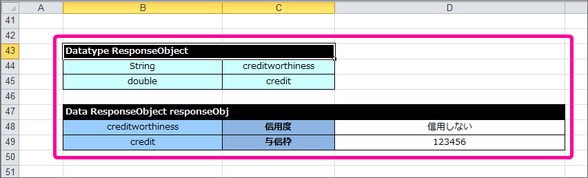 Data ResponseObject responseObj creditworthiness 信用度 信用度初期値 credit 与信枠 0 作成した Glossary から「処理のグループ」(Internal)の定義を設定してください。