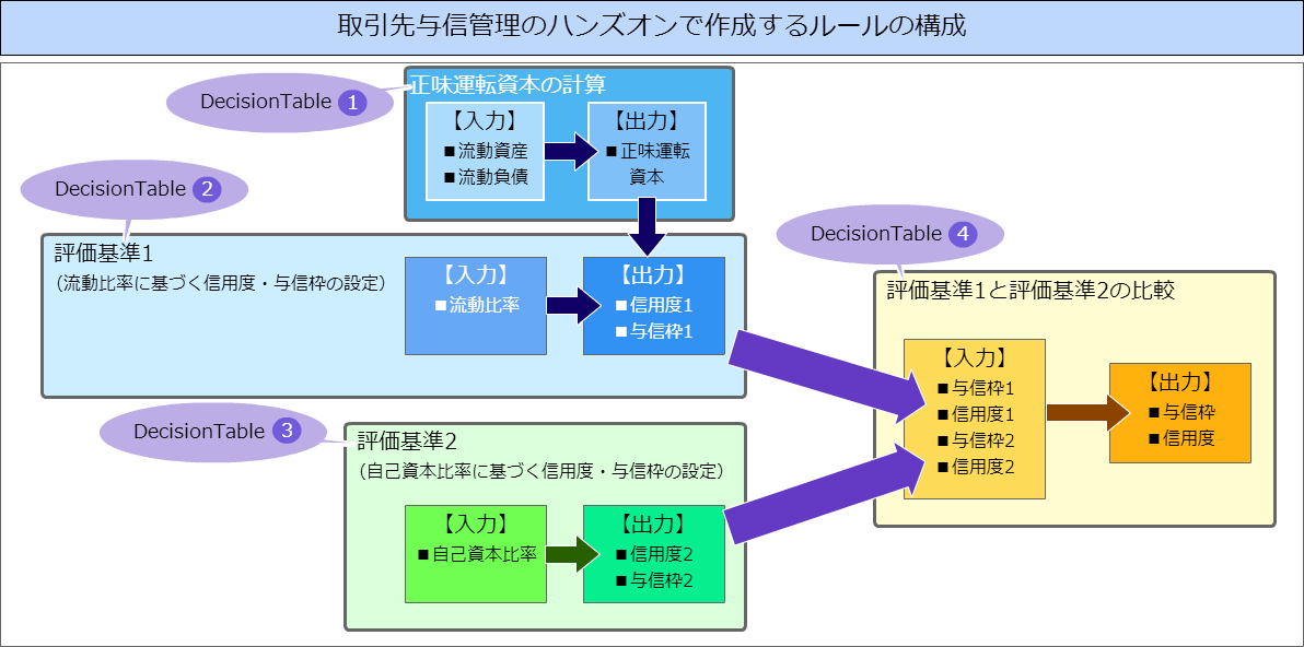 - 入力・・・「Decisiontable(2)」と「Decisiontable(3)」で取得した信用度と与信枠