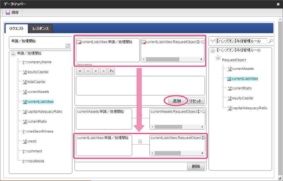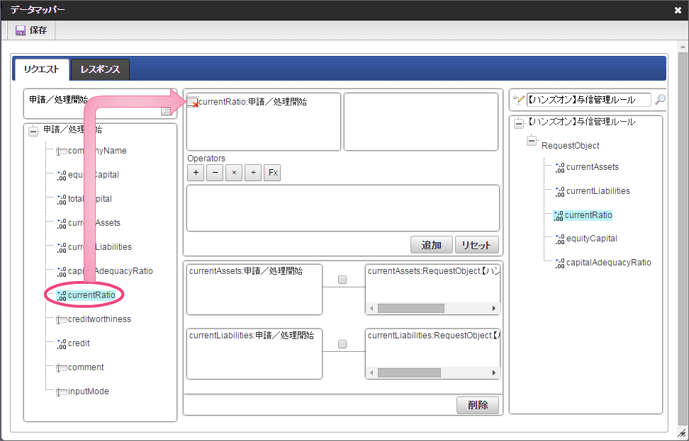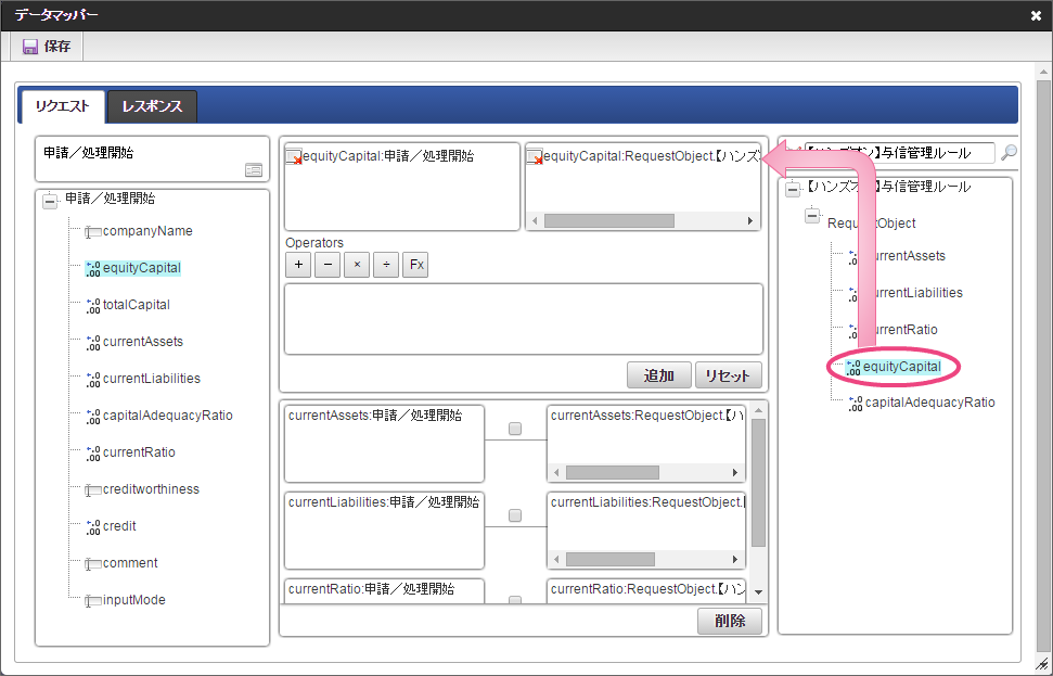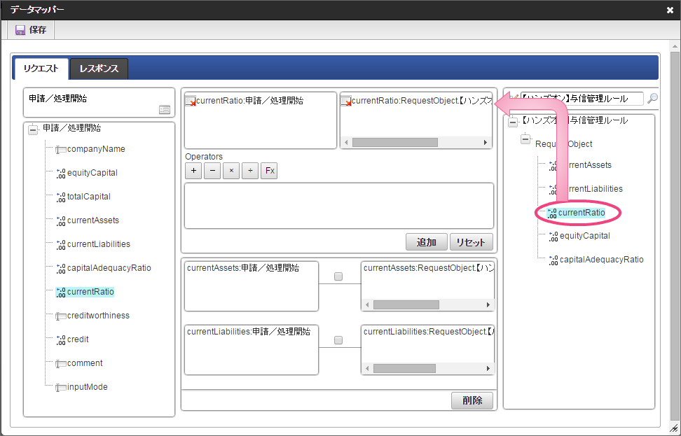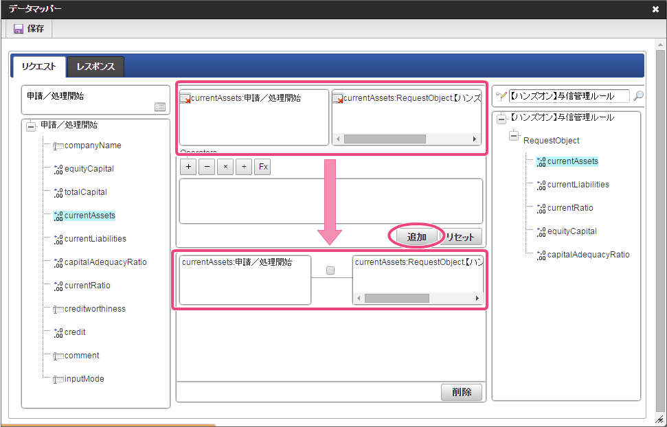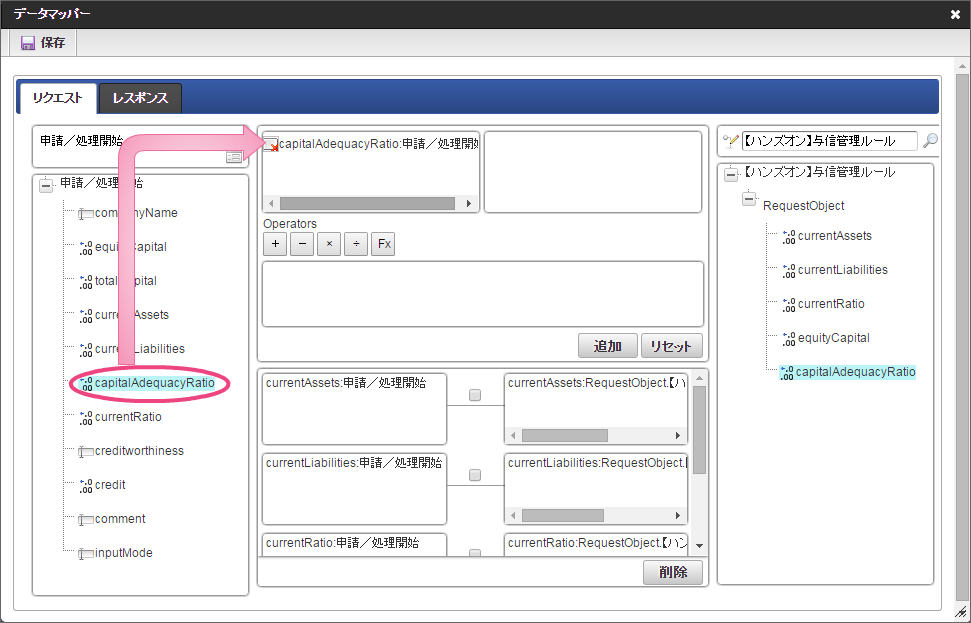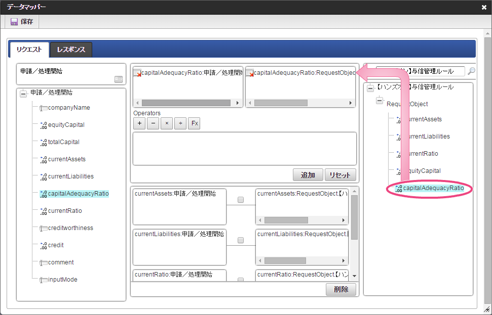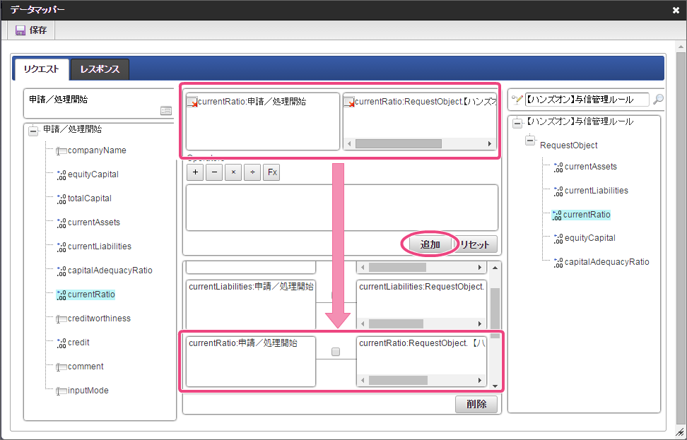 データソース選択から作成したルール「【ハンズオン】与信管理ルール」をクリックしてください。 左の欄から「currentAssets」をクリックしてください。クリック後、中央左の欄に「currentAssets: 申請/処理開始」と表示されます。 右の欄から「currentAssets」をクリックしてください。クリック後、中央右の欄に「currentAssets:RequestObject.【ハンズオン】与信管理ルール」と表示されます。 「追加」をクリックしてください。フォームの「currentAssets」とデータソース定義の「currentAssets」のマッピングが設定され、中央下段の欄に表示されます。 左の欄から「currentLiabilities」をクリックしてください。クリック後、中央左の欄に「currentLiabilities: 申請/処理開始」と表示されます。 右の欄から「currentLiabilities」をクリックしてください。クリック後、中央右の欄に「currentLiabilities:RequestObject.【ハンズオン】与信管理ルール」と表示されます。 「追加」をクリックしてください。フォームの「currentLiabilities」とデータソース定義の「currentLiabilities」のマッピングが設定され、中央下段の欄に表示されます。 左の欄から「currentRatio」をクリックしてください。クリック後、中央左の欄に「currentRatio: 申請/処理開始」と表示されます。 右の欄から「currentRatio」をクリックしてください。クリック後、中央右の欄に「currentRatio:RequestObject.【ハンズオン】与信管理ルール」と表示されます。 「追加」をクリックしてください。フォームの「currentRatio」とデータソース定義の「currentRatio」のマッピングが設定され、中央下段の欄に表示されます。 左の欄から「equityCapital」をクリックしてください。クリック後、中央左の欄に「equityCapital: 申請/処理開始」と表示されます。 右の欄から「equityCapital」をクリックしてください。クリック後、中央右の欄に「equityCapital:RequestObject.【ハンズオン】与信管理ルール」と表示されます。 「追加」をクリックしてください。フォームの「equityCapital」とデータソース定義の「equityCapital」のマッピングが設定され、中央下段の欄に表示されます。 左の欄から「capitalAdequacyRatio」をクリックしてください。クリック後、中央左の欄に「capitalAdequacyRatio: 申請/処理開始」と表示されます。 右の欄から「capitalAdequacyRatio」をクリックしてください。クリック後、中央右の欄に「capitalAdequacyRatio:RequestObject.【ハンズオン】与信管理ルール」と表示されます。 「追加」をクリックしてください。フォームの「capitalAdequacyRatio」とデータソース定義の「capitalAdequacyRatio」のマッピングが設定され、中央下段の欄に表示されます。 リクエストの設定が完了しましたので、レスポンスの設定を行うために「レスポンス」タブをクリックしてください。 左の欄から「creditworthiness」をクリックしてください。クリック後、中央左の欄に「creditworthiness: ResponseObject.【ハンズオン】与信管理ルール」と表示されます。 右の欄から「creditworthiness」をクリックしてください。クリック後、中央右の欄に「creditworthiness: 申請/処理開始」と表示されます。 「追加」をクリックしてください。データソース定義の「creditworthiness」とフォームの「creditworthiness」のマッピングが設定され、中央下段の欄に表示されます。 左の欄から「credit」をクリックしてください。クリック後、中央左の欄に「credit: ResponseObject.【ハンズオン】与信管理ルール」と表示されます。 右の欄から「credit」をクリックしてください。クリック後、中央右の欄に「credit: 申請/処理開始」と表示されます。 「追加」、「保存」の順にクリックしてください。 正常に保存できたら、「データマッパー」は右上の「」をクリックして閉じてください。