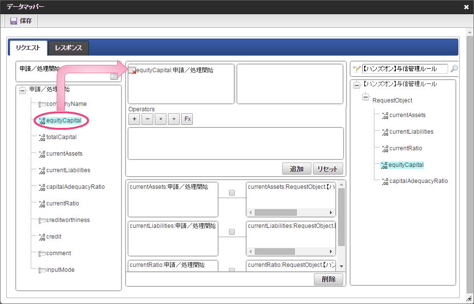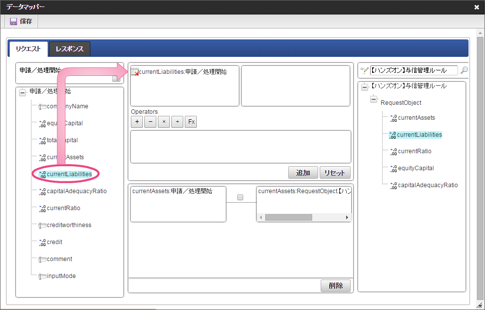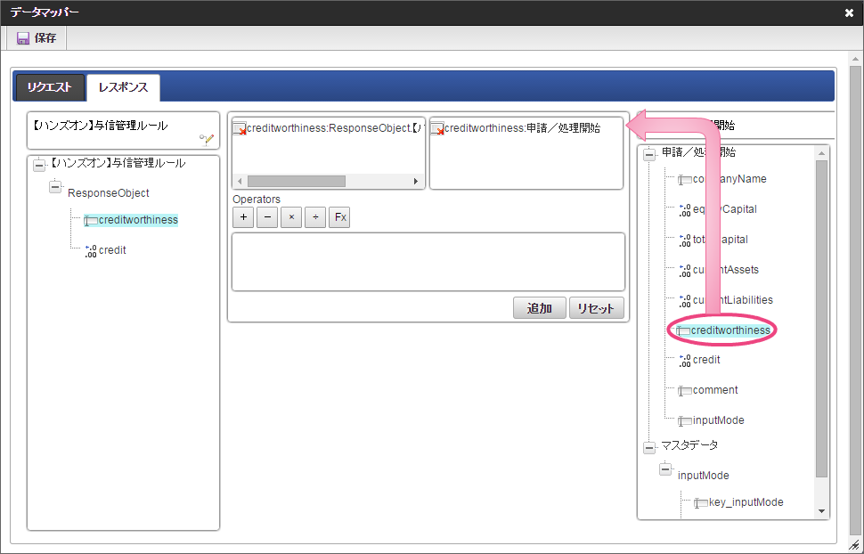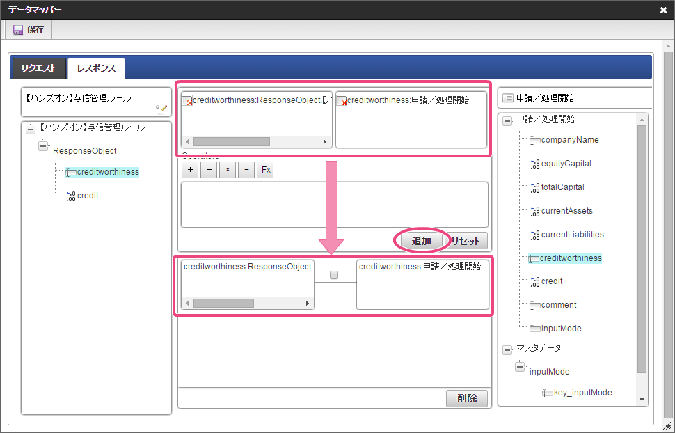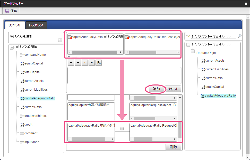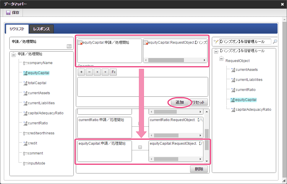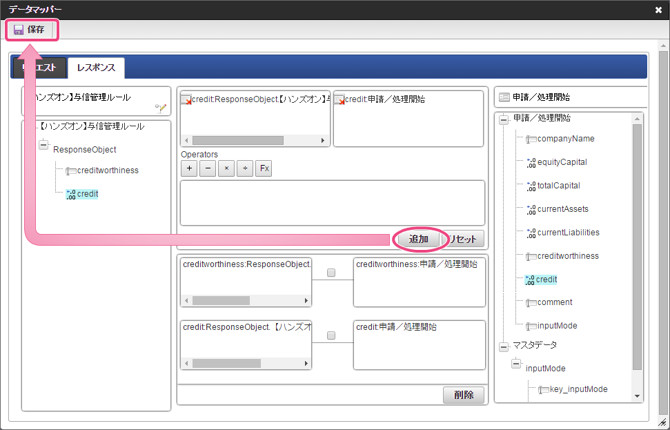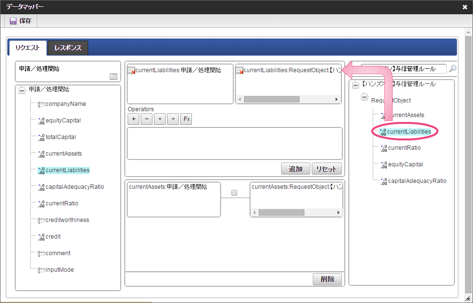 データソース選択から作成したルール「【ハンズオン】与信管理ルール」をクリックしてください。 左の欄から「currentAssets」をクリックしてください。クリック後、中央左の欄に「currentAssets: 申請/処理開始」と表示されます。 右の欄から「currentAssets」をクリックしてください。クリック後、中央右の欄に「currentAssets:RequestObject.【ハンズオン】与信管理ルール」と表示されます。 「追加」をクリックしてください。フォームの「currentAssets」とデータソース定義の「currentAssets」のマッピングが設定され、中央下段の欄に表示されます。 左の欄から「currentLiabilities」をクリックしてください。クリック後、中央左の欄に「currentLiabilities: 申請/処理開始」と表示されます。 右の欄から「currentLiabilities」をクリックしてください。クリック後、中央右の欄に「currentLiabilities:RequestObject.【ハンズオン】与信管理ルール」と表示されます。 「追加」をクリックしてください。フォームの「currentLiabilities」とデータソース定義の「currentLiabilities」のマッピングが設定され、中央下段の欄に表示されます。 左の欄から「currentRatio」をクリックしてください。クリック後、中央左の欄に「currentRatio: 申請/処理開始」と表示されます。 右の欄から「currentRatio」をクリックしてください。クリック後、中央右の欄に「currentRatio:RequestObject.【ハンズオン】与信管理ルール」と表示されます。 「追加」をクリックしてください。フォームの「currentRatio」とデータソース定義の「currentRatio」のマッピングが設定され、中央下段の欄に表示されます。 左の欄から「equityCapital」をクリックしてください。クリック後、中央左の欄に「equityCapital: 申請/処理開始」と表示されます。 右の欄から「equityCapital」をクリックしてください。クリック後、中央右の欄に「equityCapital:RequestObject.【ハンズオン】与信管理ルール」と表示されます。 「追加」をクリックしてください。フォームの「equityCapital」とデータソース定義の「equityCapital」のマッピングが設定され、中央下段の欄に表示されます。 左の欄から「capitalAdequacyRatio」をクリックしてください。クリック後、中央左の欄に「capitalAdequacyRatio: 申請/処理開始」と表示されます。 右の欄から「capitalAdequacyRatio」をクリックしてください。クリック後、中央右の欄に「capitalAdequacyRatio:RequestObject.【ハンズオン】与信管理ルール」と表示されます。 「追加」をクリックしてください。フォームの「capitalAdequacyRatio」とデータソース定義の「capitalAdequacyRatio」のマッピングが設定され、中央下段の欄に表示されます。 リクエストの設定が完了しましたので、レスポンスの設定を行うために「レスポンス」タブをクリックしてください。 左の欄から「creditworthiness」をクリックしてください。クリック後、中央左の欄に「creditworthiness: ResponseObject.【ハンズオン】与信管理ルール」と表示されます。 右の欄から「creditworthiness」をクリックしてください。クリック後、中央右の欄に「creditworthiness: 申請/処理開始」と表示されます。 「追加」をクリックしてください。データソース定義の「creditworthiness」とフォームの「creditworthiness」のマッピングが設定され、中央下段の欄に表示されます。 左の欄から「credit」をクリックしてください。クリック後、中央左の欄に「credit: ResponseObject.【ハンズオン】与信管理ルール」と表示されます。 右の欄から「credit」をクリックしてください。クリック後、中央右の欄に「credit: 申請/処理開始」と表示されます。 「追加」、「保存」の順にクリックしてください。 正常に保存できたら、「データマッパー」は右上の「」をクリックして閉じてください。