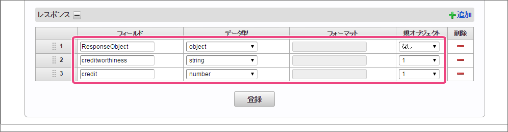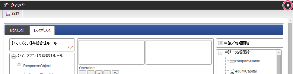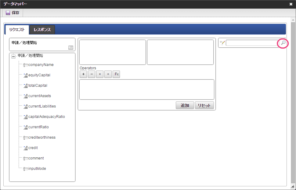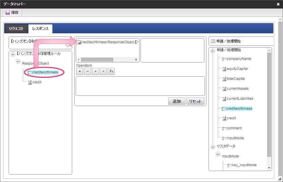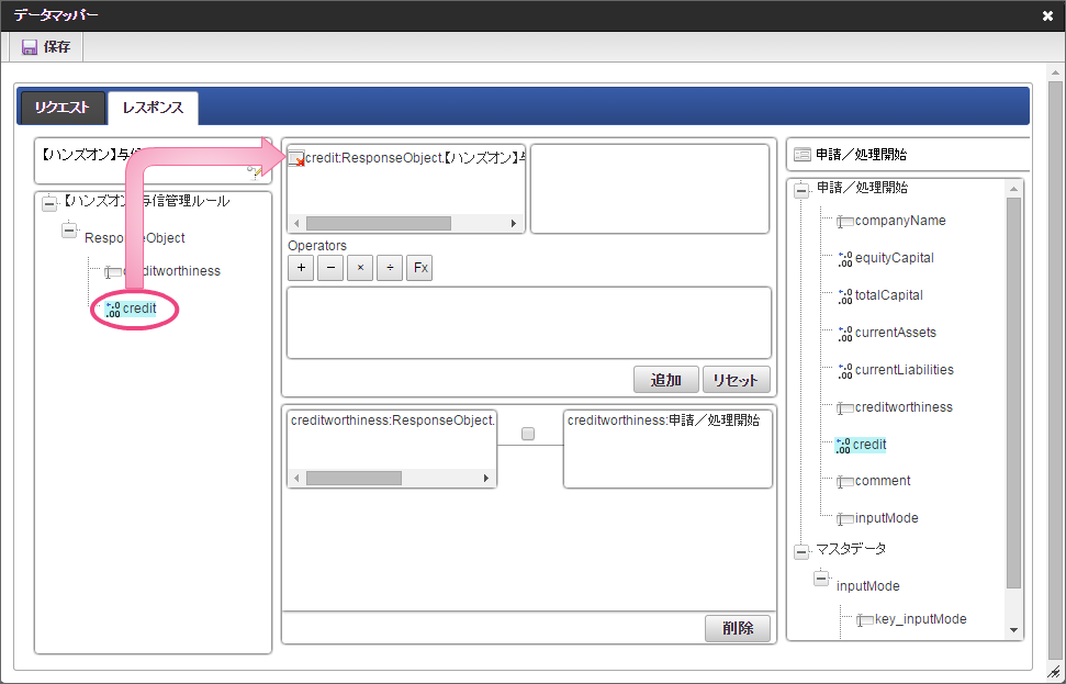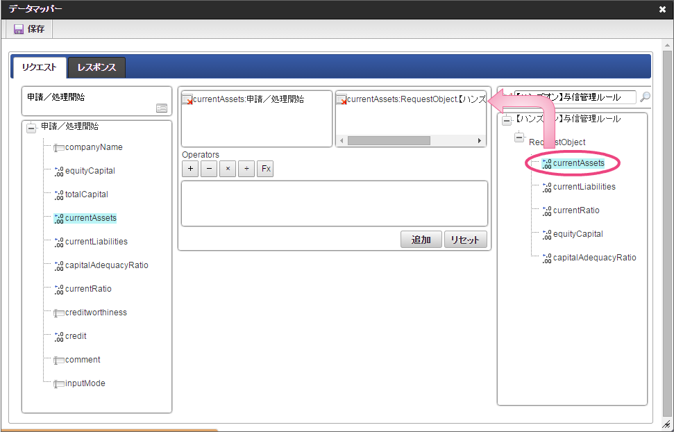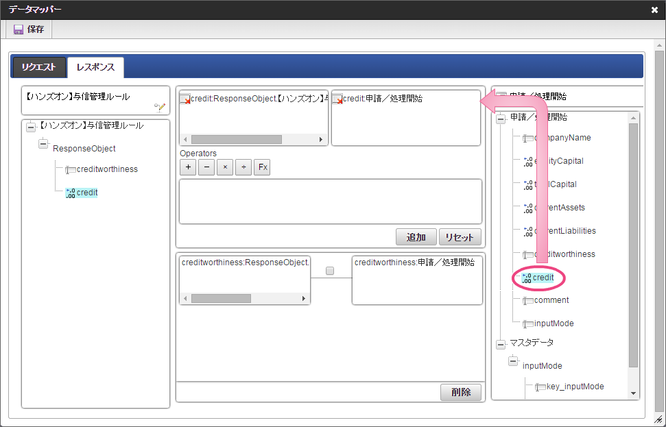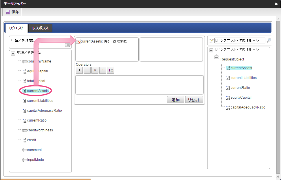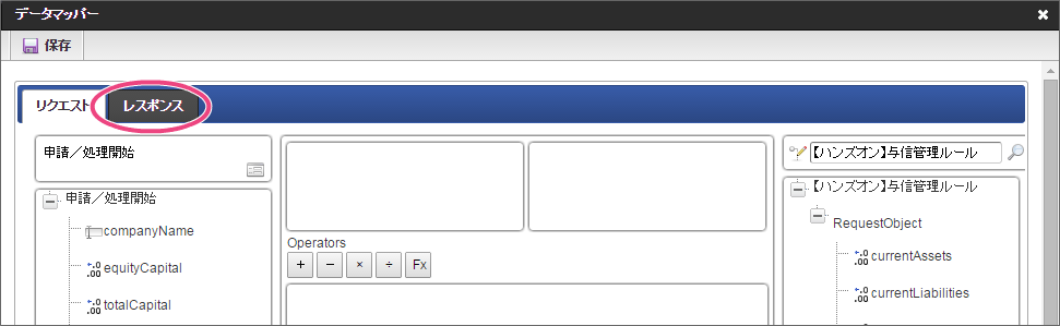 データソース選択から作成したルール「【ハンズオン】与信管理ルール」をクリックしてください。 左の欄から「currentAssets」をクリックしてください。クリック後、中央左の欄に「currentAssets: 申請/処理開始」と表示されます。 右の欄から「currentAssets」をクリックしてください。クリック後、中央右の欄に「currentAssets:RequestObject.【ハンズオン】与信管理ルール」と表示されます。 「追加」をクリックしてください。フォームの「currentAssets」とデータソース定義の「currentAssets」のマッピングが設定され、中央下段の欄に表示されます。 左の欄から「currentLiabilities」をクリックしてください。クリック後、中央左の欄に「currentLiabilities: 申請/処理開始」と表示されます。 右の欄から「currentLiabilities」をクリックしてください。クリック後、中央右の欄に「currentLiabilities:RequestObject.【ハンズオン】与信管理ルール」と表示されます。 「追加」をクリックしてください。フォームの「currentLiabilities」とデータソース定義の「currentLiabilities」のマッピングが設定され、中央下段の欄に表示されます。 左の欄から「currentRatio」をクリックしてください。クリック後、中央左の欄に「currentRatio: 申請/処理開始」と表示されます。 右の欄から「currentRatio」をクリックしてください。クリック後、中央右の欄に「currentRatio:RequestObject.【ハンズオン】与信管理ルール」と表示されます。 「追加」をクリックしてください。フォームの「currentRatio」とデータソース定義の「currentRatio」のマッピングが設定され、中央下段の欄に表示されます。 左の欄から「equityCapital」をクリックしてください。クリック後、中央左の欄に「equityCapital: 申請/処理開始」と表示されます。 右の欄から「equityCapital」をクリックしてください。クリック後、中央右の欄に「equityCapital:RequestObject.【ハンズオン】与信管理ルール」と表示されます。 「追加」をクリックしてください。フォームの「equityCapital」とデータソース定義の「equityCapital」のマッピングが設定され、中央下段の欄に表示されます。 左の欄から「capitalAdequacyRatio」をクリックしてください。クリック後、中央左の欄に「capitalAdequacyRatio: 申請/処理開始」と表示されます。 右の欄から「capitalAdequacyRatio」をクリックしてください。クリック後、中央右の欄に「capitalAdequacyRatio:RequestObject.【ハンズオン】与信管理ルール」と表示されます。 「追加」をクリックしてください。フォームの「capitalAdequacyRatio」とデータソース定義の「capitalAdequacyRatio」のマッピングが設定され、中央下段の欄に表示されます。 リクエストの設定が完了しましたので、レスポンスの設定を行うために「レスポンス」タブをクリックしてください。 左の欄から「creditworthiness」をクリックしてください。クリック後、中央左の欄に「creditworthiness: ResponseObject.【ハンズオン】与信管理ルール」と表示されます。 右の欄から「creditworthiness」をクリックしてください。クリック後、中央右の欄に「creditworthiness: 申請/処理開始」と表示されます。 「追加」をクリックしてください。データソース定義の「creditworthiness」とフォームの「creditworthiness」のマッピングが設定され、中央下段の欄に表示されます。 左の欄から「credit」をクリックしてください。クリック後、中央左の欄に「credit: ResponseObject.【ハンズオン】与信管理ルール」と表示されます。 右の欄から「credit」をクリックしてください。クリック後、中央右の欄に「credit: 申請/処理開始」と表示されます。 「追加」、「保存」の順にクリックしてください。 正常に保存できたら、「データマッパー」は右上の「」をクリックして閉じてください。