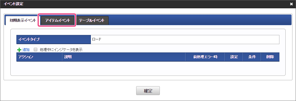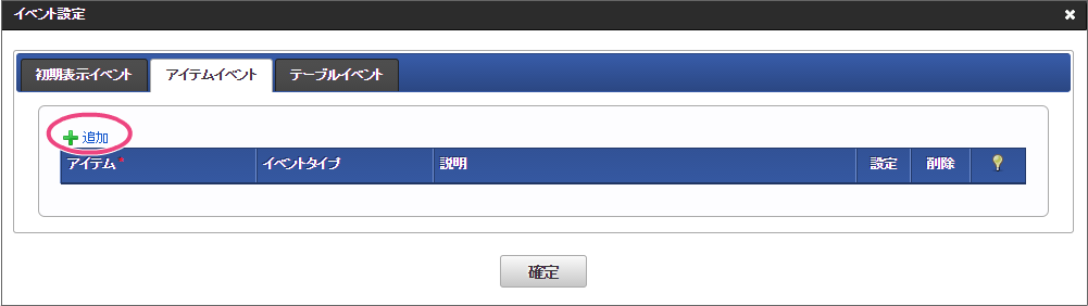 フォーム編集画面を表示したら「アクション設定」をクリックしてください。 「アイテムイベント」をクリックして、表示するタブを切り替えます。 「追加」をクリックしてください。