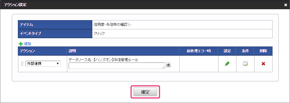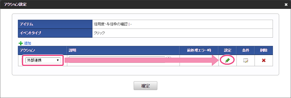 「アクション」を「外部連携」に設定後、「」をクリックしてください。