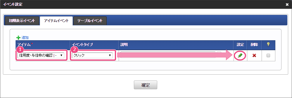アイテムとイベントタイプを以下の通りに変更後、「」をクリックしてください。