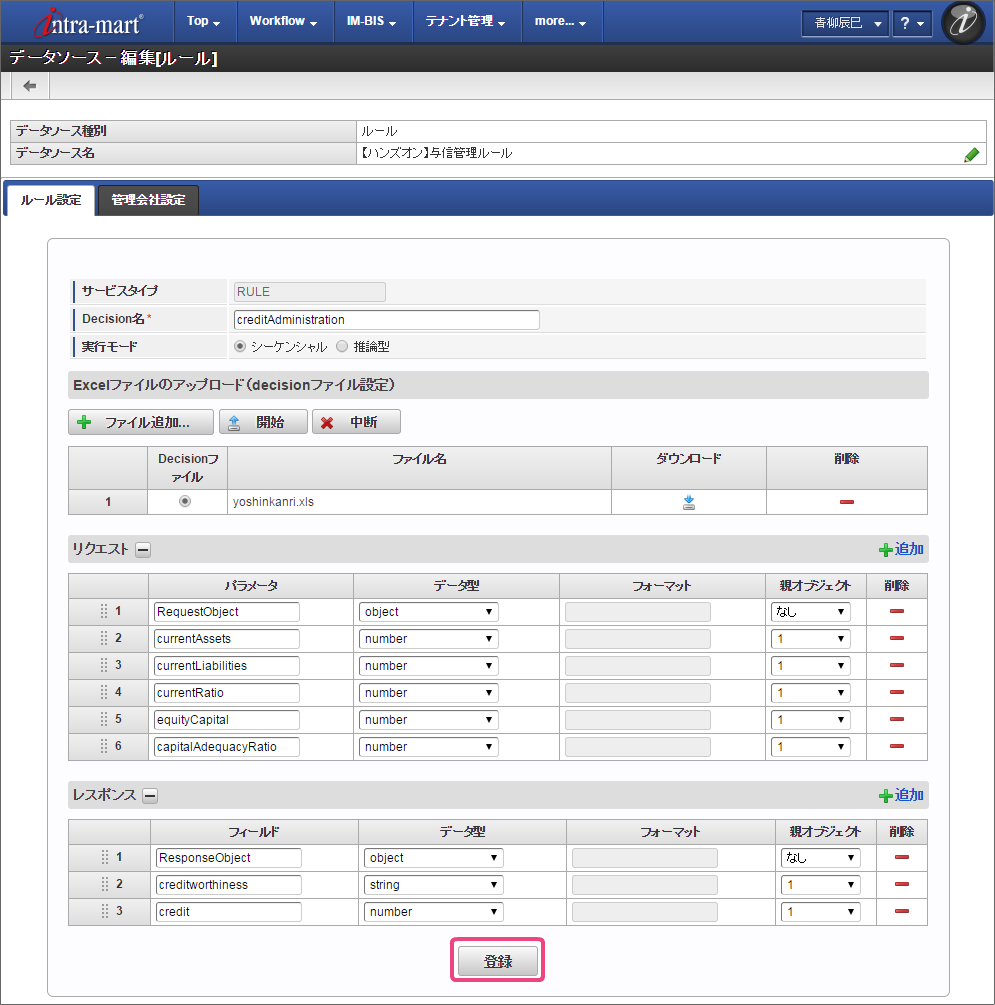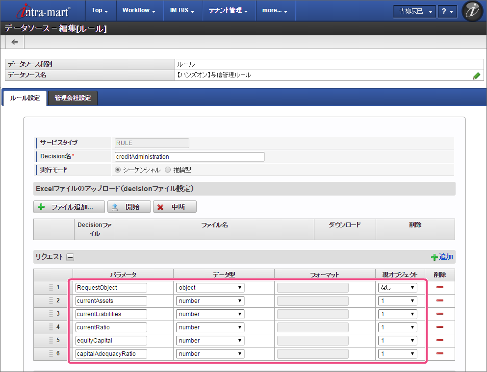 「Decision名」には、Excelファイルの Decision の名前「creditAdministration」を入力してください。 「リクエスト」には、 Glossary で定義した「RequestObject」のオブジェクトと項目(物理名)を登録します。入力欄を追加し、以下の通りに設定してください。 同様に「レスポンス」には、「ResponseObject」のオブジェクトと項目(物理名)を登録します。入力欄を追加し、以下の通りに設定してください。 作成したExcelのルール定義ファイルをアップロードするために「ファイル追加」をクリックしてください。 「開始」をクリックして、ファイルをアップロードしてください。 「Decisionファイル」のラジオボタンをクリックしてオンにしてください。 最後に「登録」をクリックして、データソース定義を登録してください。 これで OpenRules のルールを定義したExcelファイルをデータソース定義として登録することができました。