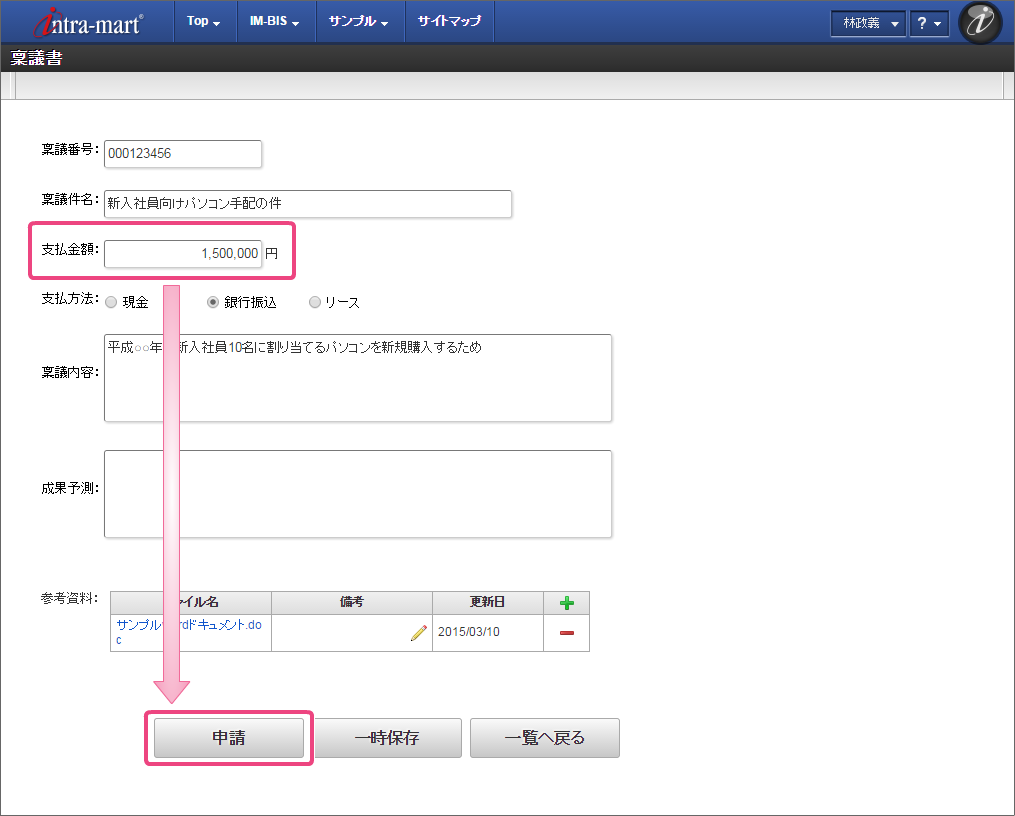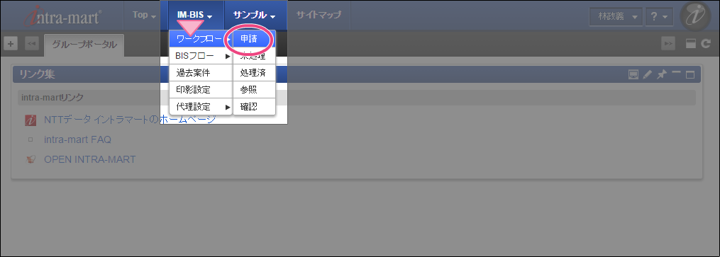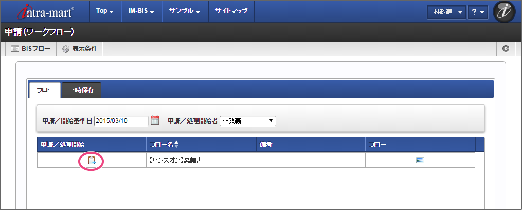 申請者のユーザ(例では、「林政義」)でログインしましょう。 上部のメニューの「 IM-BIS 」→「ワークフロー」の順にマウスを重ねてから「申請」をクリックしてください。 「【ハンズオン】稟議書」の「申請/処理開始」をクリックしてください。