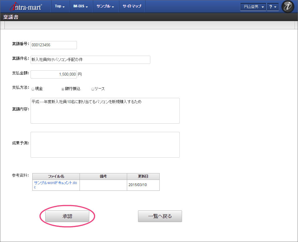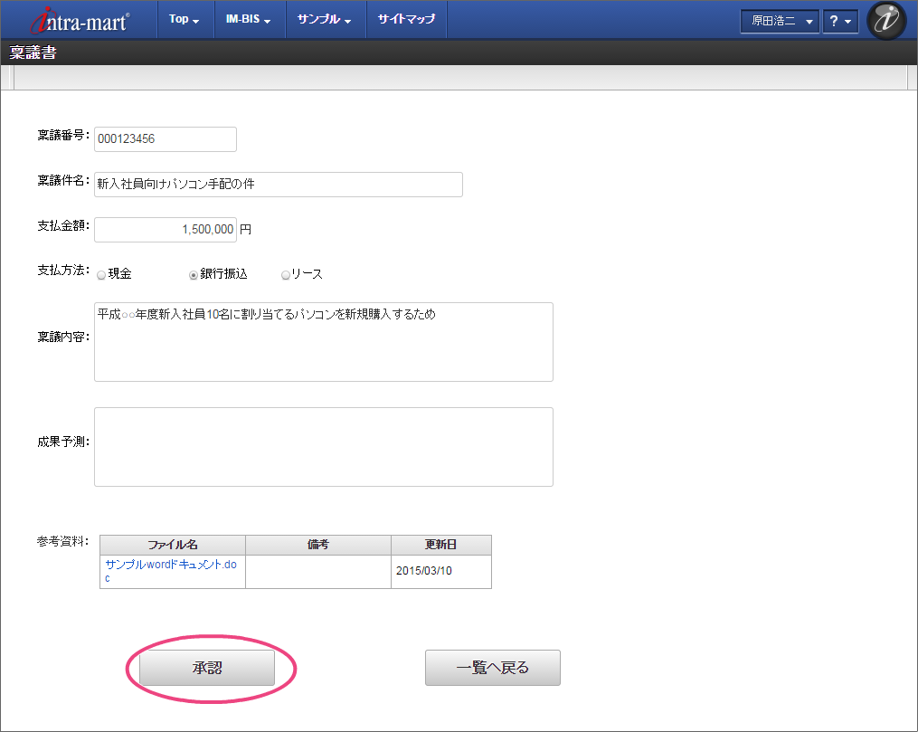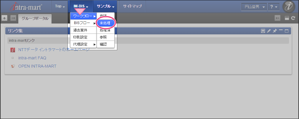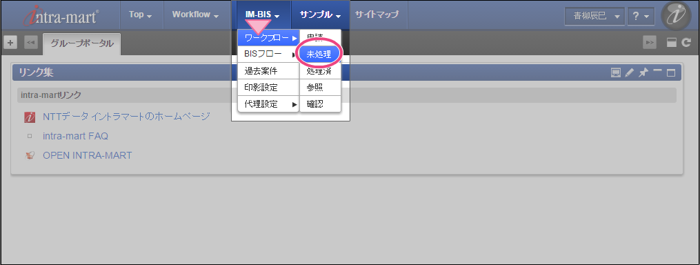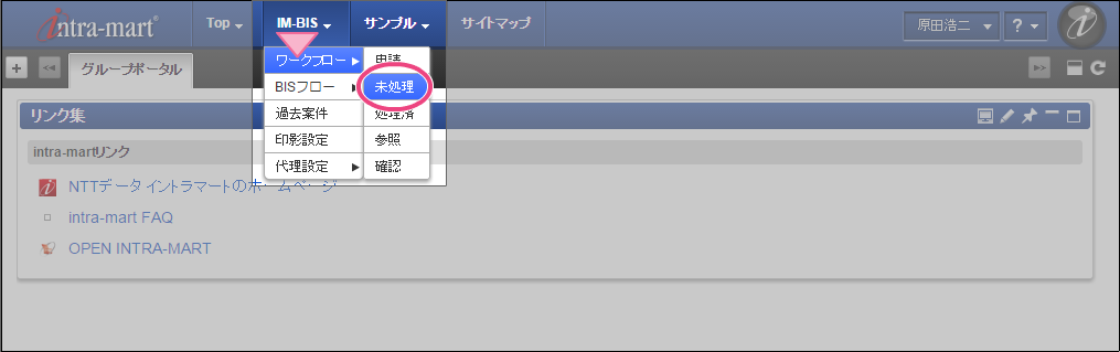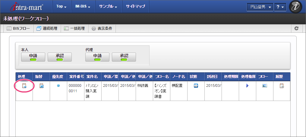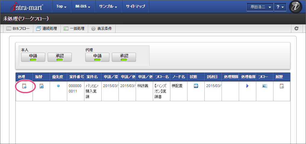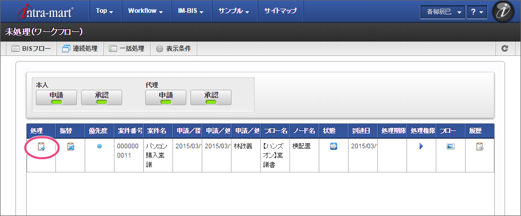OpenRules での結果に基づいて、最後の処理対象者に設定された役職の社長の「原田浩二」でログインしましょう。 上部のメニューの「 IM-BIS 」→「ワークフロー」の順にマウスを重ねてから「未処理」をクリックしてください。 林さんが申請した案件の「処理」をクリックしてください。
