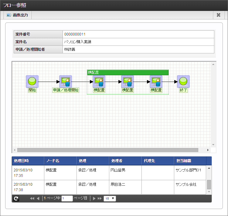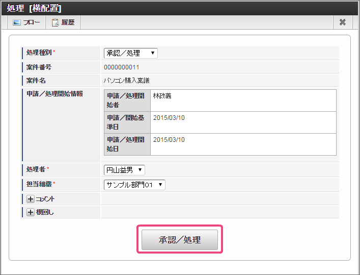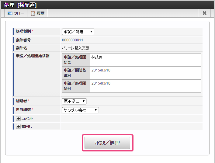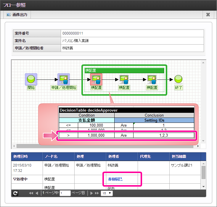 内容を確認し、「承認」をクリックしてください。 「承認/処理」をクリックすると、原田さんの承認が完了します。原田さんがこのフローの最終処理対象者となっているため、これで案件が完了します。 完了時点のフローを確認すると、以下のように表示されます。 今回は、3つの処理対象者が設定されるパターンを確認できましたが、支払金額を変更すると処理対象者が OpenRules の条件で変わります。支払金額を変更して他のパターンも確認してみてください。
