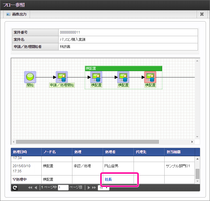 申請内容に基づいて、横配置ノードを展開されます。ハンズオンでは3つのノードに展開されます。横配置ノードの1番目のノードには、ユーザ:青柳辰巳が設定されます。