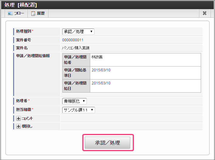 画面の各項目の内容を入力します。今回は、次の処理対象者を社長まで対象とするルートにするために、支払金額には「1,500,000」と入力しましょう。必要な項目の入力が終わったら、「申請」をクリックしてください。 案件名を入力したら、「申請/処理開始」をクリックしてください。これで、林さんの申請は完了です。 この時点のフローを確認すると、申請画面に入力した支払金額に基づいて、横配置ノードが3つのノードとして展開されています。展開されたノードのうち、1番目のノードの処理対象者の青柳さんに切り替えて操作しましょう。
