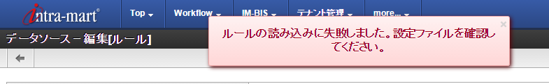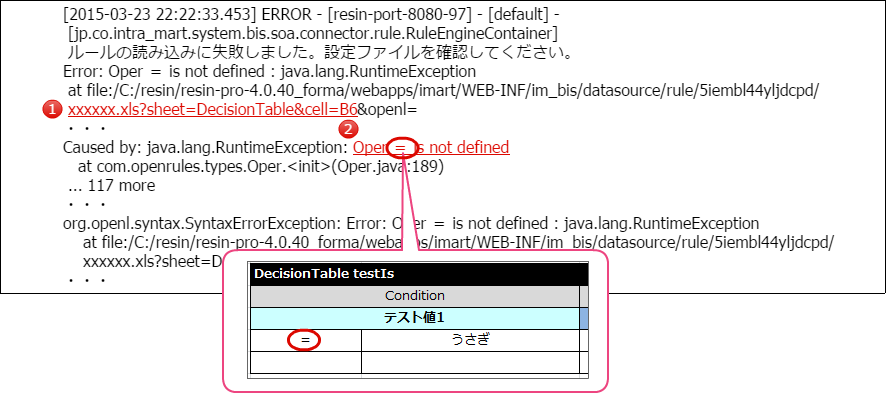 [2015-03-23 22:22:33.453] ERROR - [resin-port-8080-97] - [default] - [jp.co.intra_mart.system.bis.soa.connector.rule.RuleEngineContainer] ルールの読み込みに失敗しました。設定ファイルを確認してください。 Error: Oper = is not defined : java.lang.RuntimeException at file:/C:/resin/resin-pro-4.0.40_forma/webapps/imart/WEB-INF/im_bis/datasource/rule/5iembl44yljdcpd/ xxxxxx.xls?sheet=DecisionTable&cell=B6&openl= ・・・ Caused by: java.lang.RuntimeException: Oper = is not defined at com.openrules.types.Oper.<init>(Oper.java:189) ... 117 more ・・・ org.openl.syntax.SyntaxErrorException: Error: Oper = is not defined : java.lang.RuntimeException at file:/C:/resin/resin-pro-4.0.40_forma/webapps/imart/WEB-INF/im_bis/datasource/rule/5iembl44yljdcpd/ xxxxxx.xls?sheet=DecisionTable&cell=B6&openl= ・・・