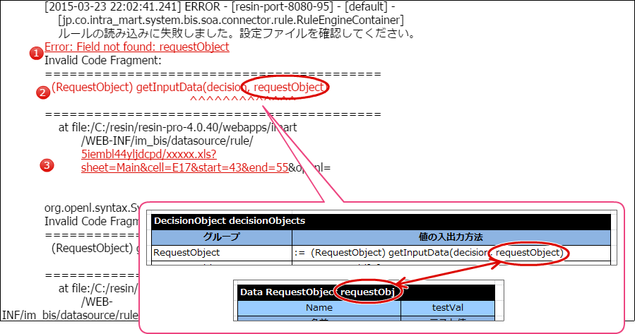 [2015-03-23 22:02:41.241] ERROR - [resin-port-8080-95] - [default] - [jp.co.intra_mart.system.bis.soa.connector.rule.RuleEngineContainer] ルールの読み込みに失敗しました。設定ファイルを確認してください。 Error: Field not found: requestObject Invalid Code Fragment: ========================================= (RequestObject) getInputData(decision, requestObject) ^^^^^^^^^^^^^ ========================================= at file:/C:/resin/resin-pro-4.0.40_forma/webapps/forma40_bis/WEB-INF/im_bis/datasource/rule/5iembl44yljdcpd/xxxxx.xls?sheet=Main&cell=E17&start=43&end=55&openl= org.openl.syntax.SyntaxErrorException: Error: Field not found: requestObject Invalid Code Fragment: ========================================= (RequestObject) getInputData(decision, requestObject) ^^^^^^^^^^^^^ ========================================= at file:/C:/resin/resin-pro-4.0.40_forma/webapps/forma40_bis/WEB-INF/im_bis/datasource/rule/5iembl44yljdcpd/xxxxx.xls?sheet=Main&cell=E17&start=43&end=55&openl=