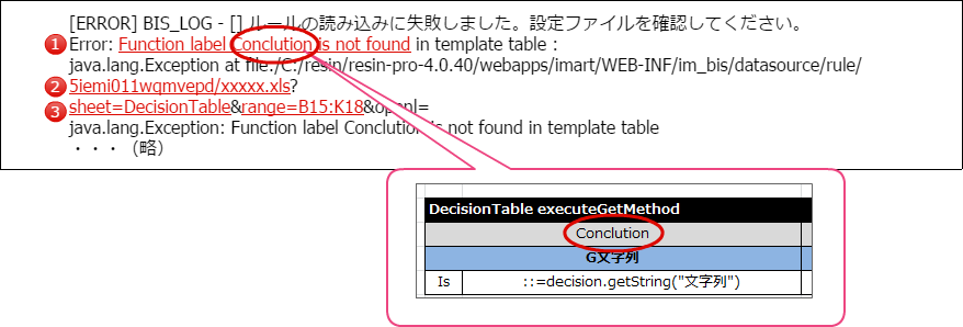 [ERROR] BIS_LOG - [] ルールの読み込みに失敗しました。設定ファイルを確認してください。 Error: Function label Conclution is not found in template table : java.lang.Exception at file:/C:/resin/resin-pro-4.0.40_forma/webapps/imart/WEB-INF/im_bis/datasource/rule/5iemi011wqmvepd/xxxxx.xls?sheet=DecisionTable&range=B15:K18&openl= java.lang.Exception: Function label Conclution is not found in template table