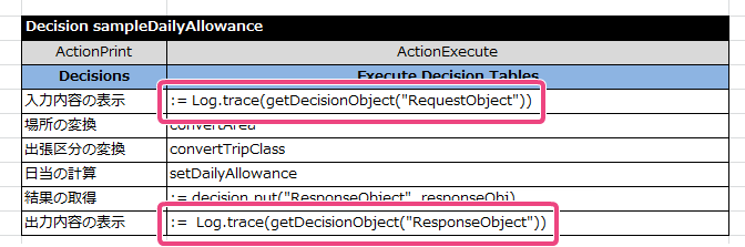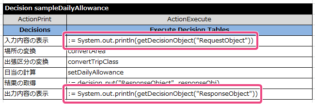 上記のように設定を行った後、ルールを実行すると、以下のような形で出力されますので、内容を確認し、エラーの解決等にご利用ください。[INFO] o.o.u.Log - [] *** Decision sampleDailyAllowance *** [INFO] o.o.u.Log - [] Decision has been initialized [INFO] o.o.u.Log - [] Decision Run has been initialized [INFO] o.o.u.Log - [] Decision sampleDailyAllowance: 入力内容の表示 RequestObject(id=0) { areaClassCode=overseas tripClassCode=single-day } [INFO] o.o.u.Log - [] Decision sampleDailyAllowance: 場所の変換 [INFO] o.o.u.Log - [] Conclusion: 場所 = 国外 [INFO] o.o.u.Log - [] Decision sampleDailyAllowance: 出張区分の変換 [INFO] o.o.u.Log - [] Conclusion: 出張区分 = 日帰り [INFO] o.o.u.Log - [] Decision sampleDailyAllowance: 日当の計算 [INFO] o.o.u.Log - [] Conclusion: 日当 = 2000 [INFO] o.o.u.Log - [] Decision sampleDailyAllowance: 結果の取得 [INFO] o.o.u.Log - [] Decision sampleDailyAllowance: 出力内容の表示 ResponseObject(id=0) { dailyAllowance=2000 dummy=ダミー内容 } [INFO] o.o.u.Log - [] Decision has been finalized