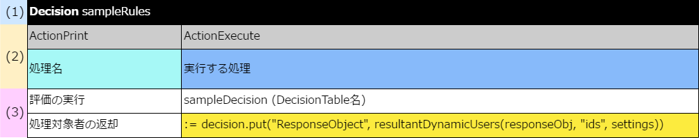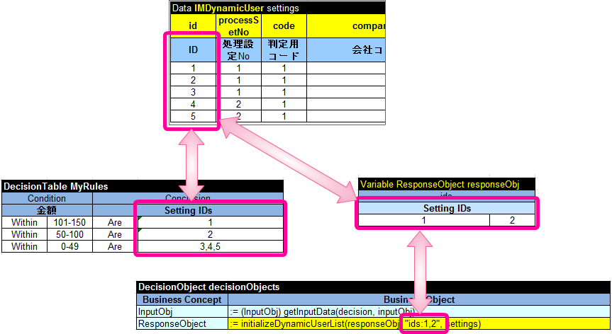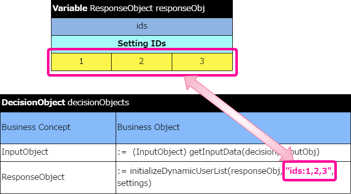 := initializeDynamicUserList(返却するオブジェクトの型名, resultantDynamicUsers(返却するオブジェクトのインスタンス名, 返却する処理対象者の対象IDを格納する項目の物理名, settings))記述例:= decision.put("ResponseObject", resultantDynamicUsers(responseObj, "ids", settings))