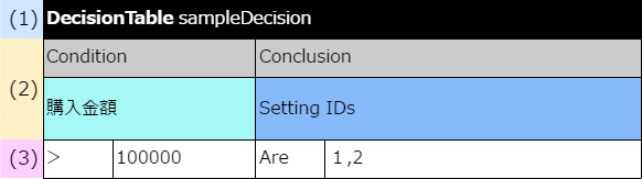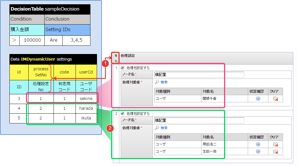 横配置・縦配置に処理対象者を設定する場合に、展開したノードの何番目に設定するかを設定します。動的承認ノードには、1を指定します。横配置・縦配置ノードで複数のノードに展開する場合、1つのノードに対して番号に抜けがないようにしてください。以下は、DecisionTable のSetting IDsに複数の処理対象者を設定した例です。