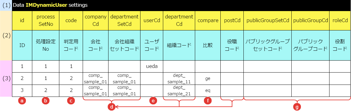 このテーブルのサブヘッダは、「IMDynamicUser」の定義に合わせて設定します。「IMDynamicUser」については、「 IM-BIS 仕様書 」の「 動的処理対象者設定に関する仕様 」を参照してください。上段が設定項目の物理名、下段が設定項目の論理名です。