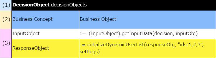 DecisionObjectのサブヘッダには、「Business Concept」と「Business Object」を記述します。Glossary と同様にヘッダの内容は、漢字を含めてわかりやすい名称に変更することができます。