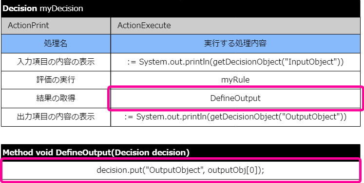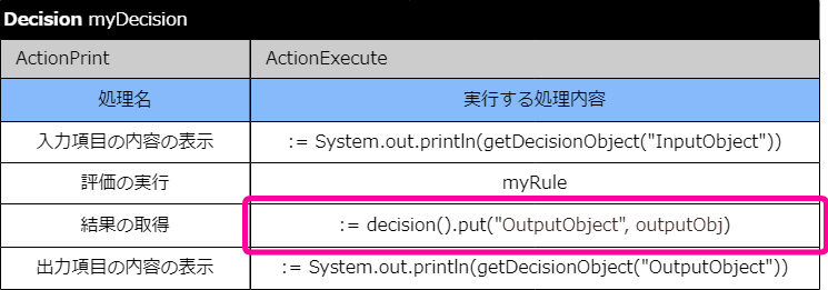 OpenRules 7.0.0 では「 Decision 」内でdecisionインスタンスのputメソッドを実行できなくなりました。 そのため、putメソッドを別メソッド内で実行する必要があります。 本ドキュメント内のハンズオンのサンプルモジュールは、下記修正が反映されています。 また、各章のハンズオンは、OpenRules 7.0.0 を利用する場合、以下の記述部分は置き換えて参照してください。 OpenRules 6.4.2以前での記述方法 OpenRules 7.0.0以降での記述方法