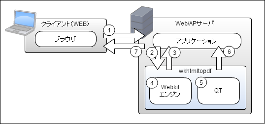 以下は、PDF出力機能の処理イメージです。① クライアントから IM-FormaDesignerアプリケーションのPDFファイルダウンロードを実行します。② アプリケーションは、コマンドベースでwkhtmltopdfにPDF作成を指示します。③ wkhtmltopdfは、HTTPリクエストでPDF出力用HTMLを取得します。取得したHTML内の静的ファイル・Ajax通信のリクエスト先は、APサーバにてベースURL設定に置き換えられます。④ Webkitエンジンは、PDF出力用HTMLを読み取り、静的ファイルの取得やAjax通信を実施します。リクエスト先はAPサーバにて置き換えられたベースURLです。レンダリングとクライアントサイドJavaScriptを実行をして、対象Forma画面のイメージを作成します。⑤ QTは、画面イメージからPDFを作成します。⑥ wkhtmltopdfは、作成したPDFを返却します。⑦ アプリケーションは、作成したPDFを返却します。