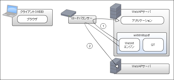Webサーバやロードバランサーをご利用している環境で、ベースURLを設定している場合は、wkhtmltopdfからリクエスト先を考慮し対応を検討する必要があります。wkhtmltopdfが、PDF出力用HTMLを読み取り、静的ファイルの取得やAjax通信を行うため以下の点が懸念されます。