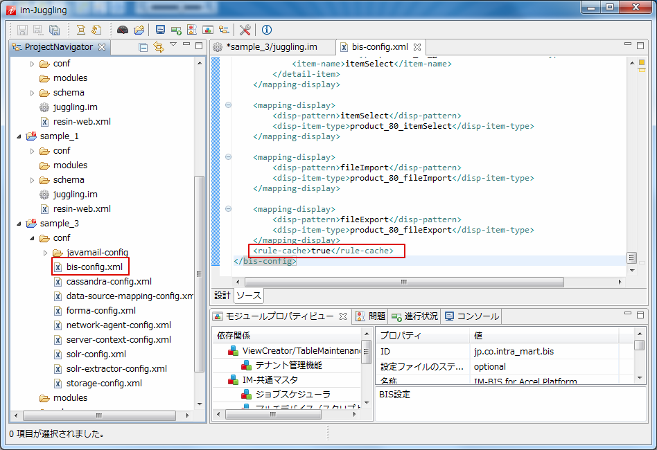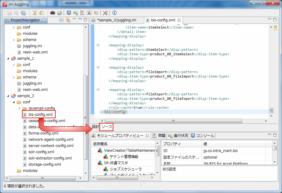「ProjectNavigator」内の 「<(プロジェクト名)/conf/bis-config.xml> ファイル」をダブルクリックで開き、「ソース」タブを選択してください。
