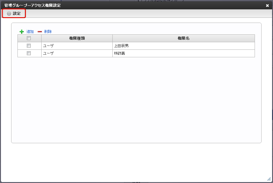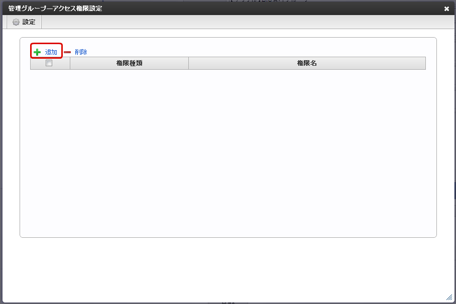 「管理グループ - アクセス権限設定」画面で「追加」をクリックします。