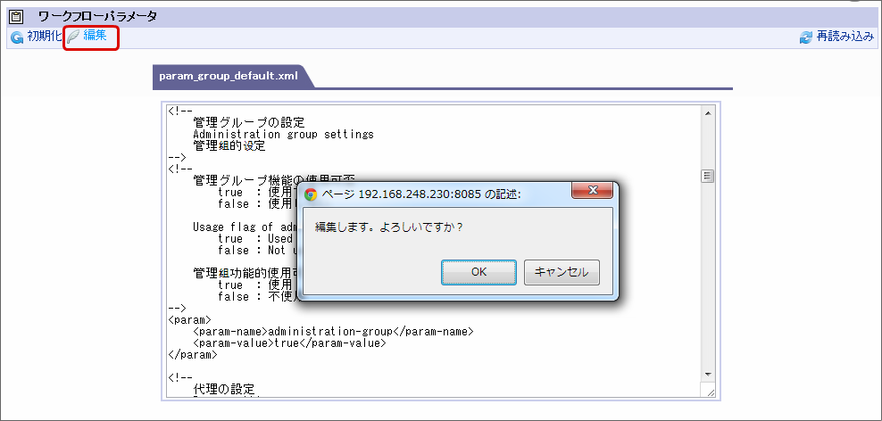 「編集」をクリックします。確認ダイアログが表示されたら「OK」をクリックします。