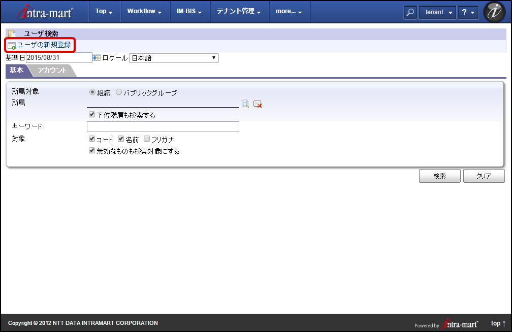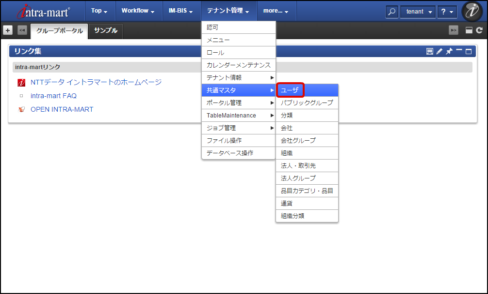 テナント管理者のメニュー画面を表示します。「テナント管理」→「共通マスタ」→「ユーザ」をクリックします。「ユーザの新規登録」をクリックします。