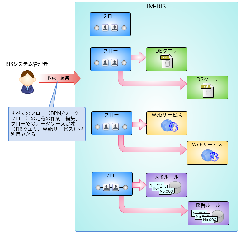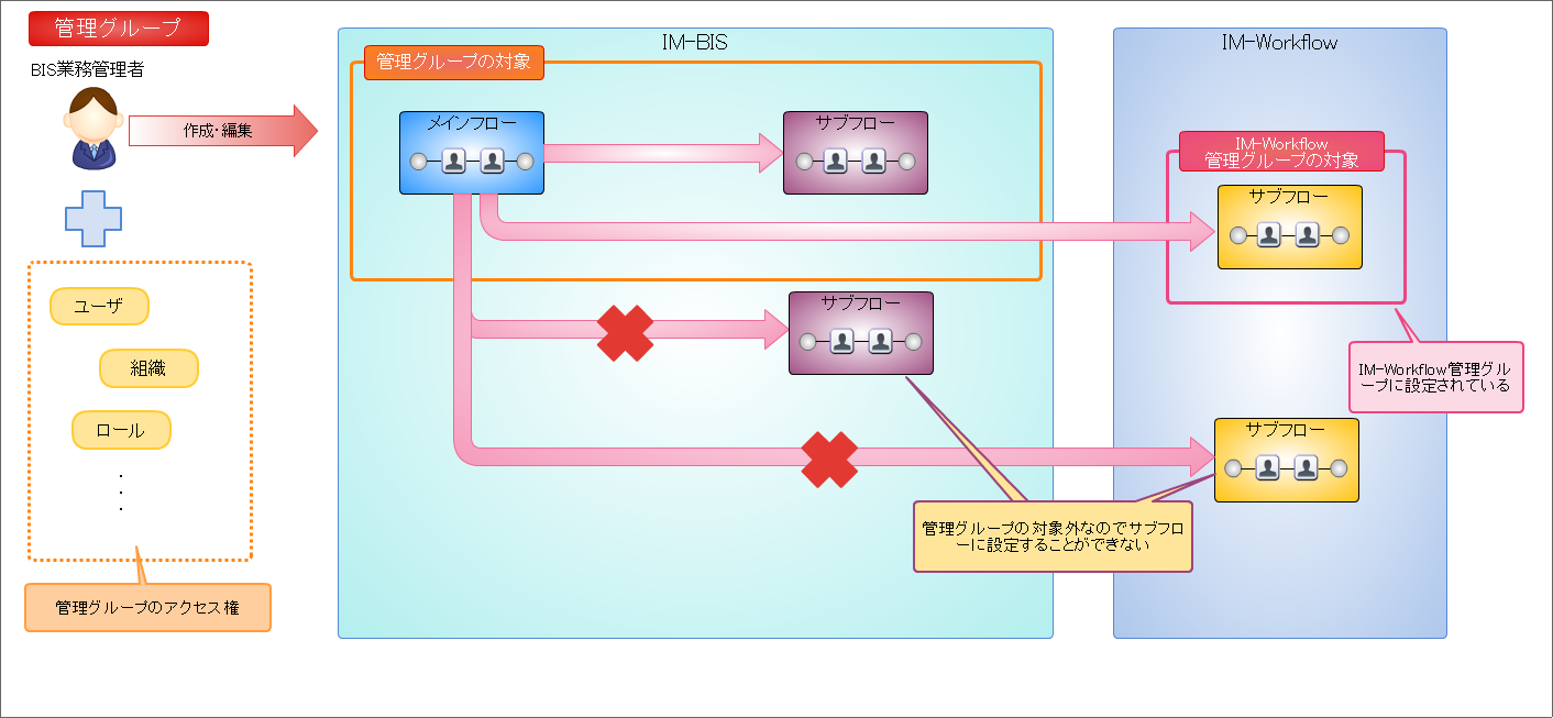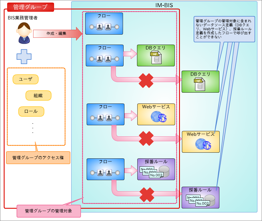 - IM-BIS では、「管理グループ」に基づいて、フローの作成が行えるユーザや組織、作成や編集が可能なフローやデータソースを設定します。