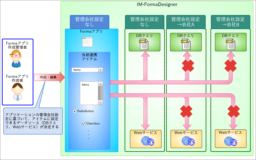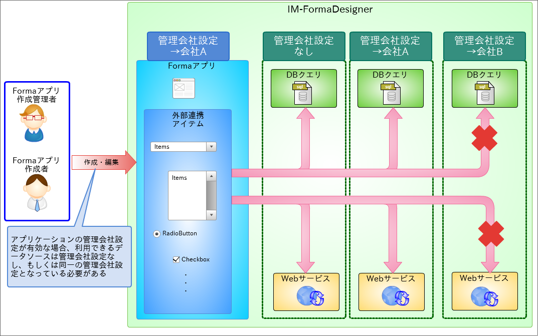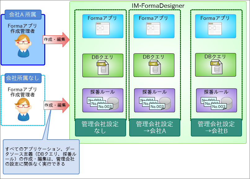 - IM-BIS では、「管理会社」とユーザの所属する会社に基づいて、作成や編集が可能なアプリケーションやデータソースを設定します。