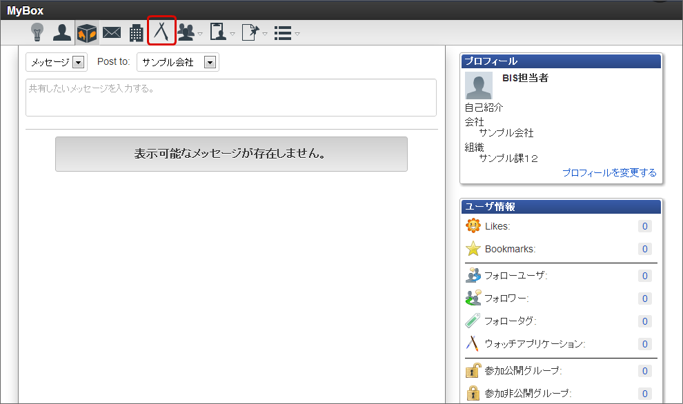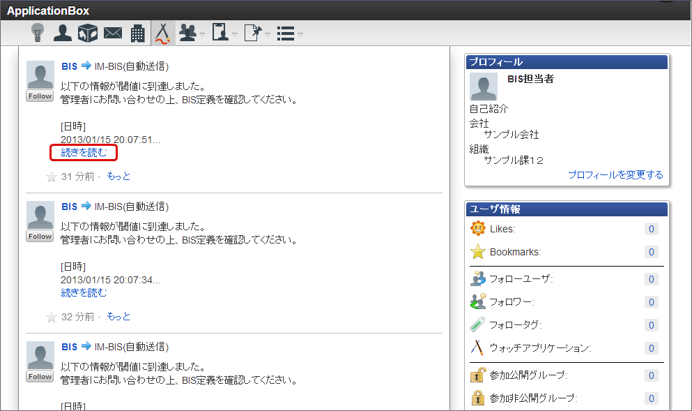 通知メッセージが届いている場合には、メニュー上にある電球のアイコンが光りますので、クリックします。光っていない場合には、「ApplicationBox」をクリックします。「IM-BIS(自動送信)」が宛先となっているメッセージがタイムラインに表示されますので、対象のメッセージの「続きを読む」をクリックします。