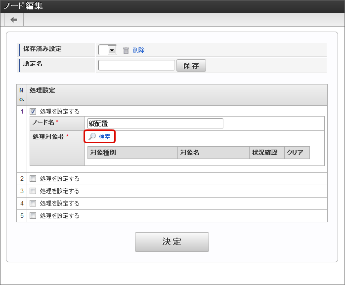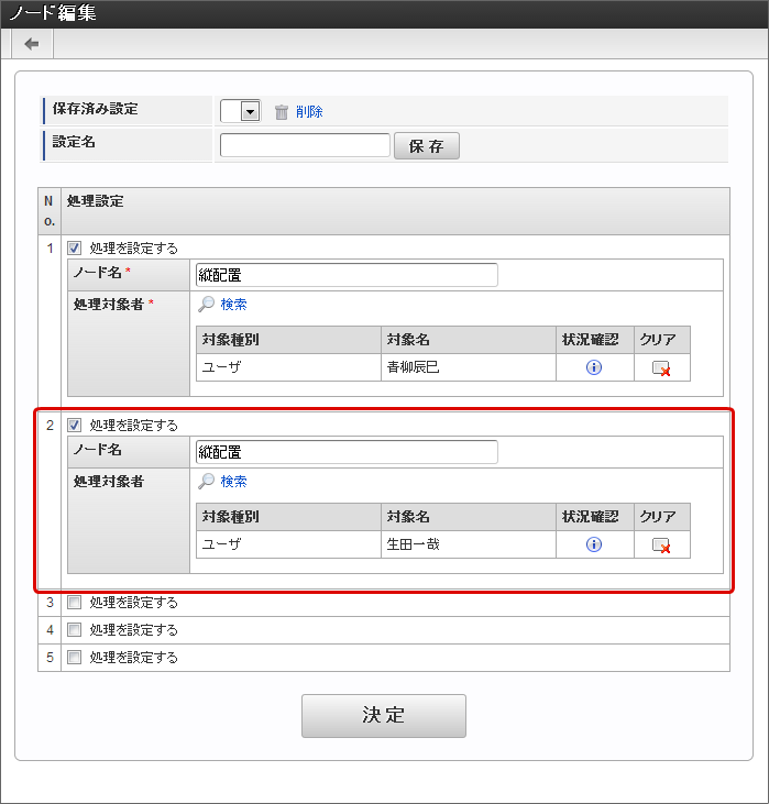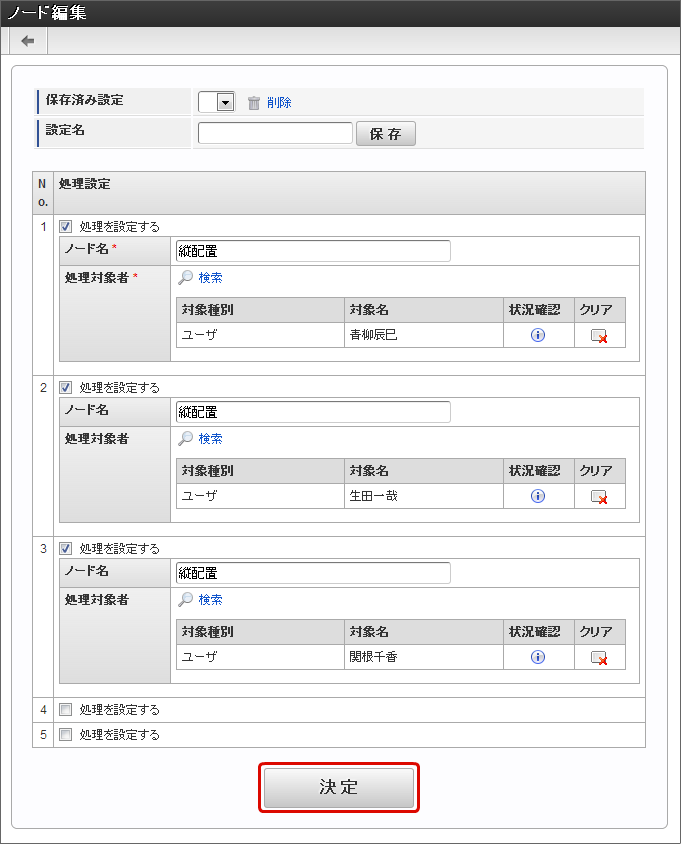 「ユーザ検索」画面で縦配置ノードの処理対象者を選択して「決定」をクリックします。