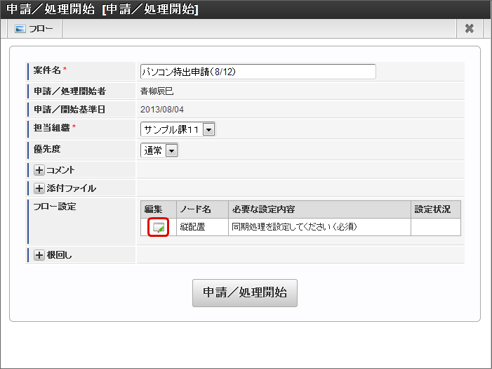 縦配置・横配置ノードを含むフローでは、申請・承認時に承認が必要なノード数と処理対象者を設定します。