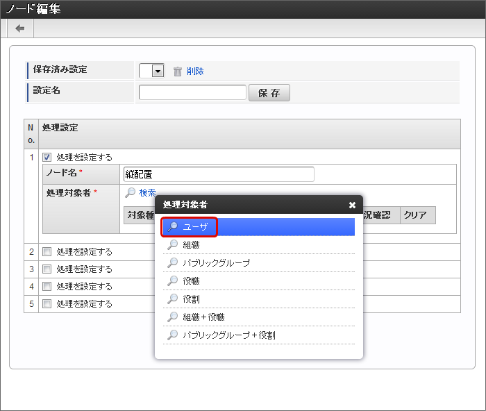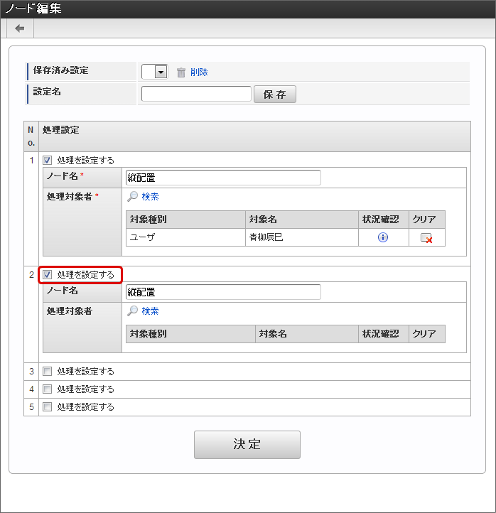 縦配置ノードの2つめの処理対象者を設定するために「処理を設定する」のチェックをオンにします。