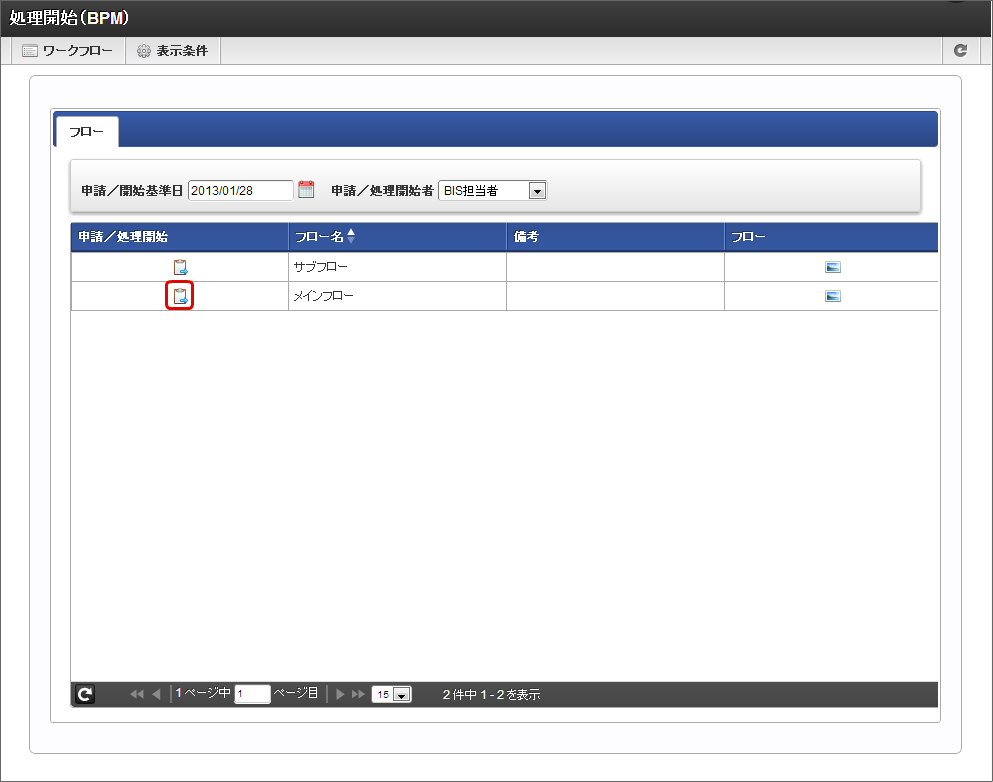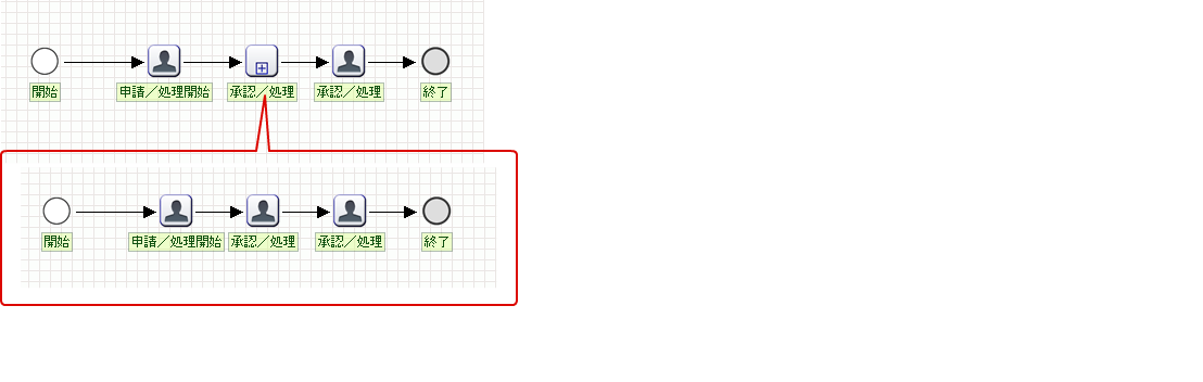 フローにサブフローを設定している場合、メインとなるフローがサブフローの設定されているノードまで到達したら申請/処理を開始することができます。