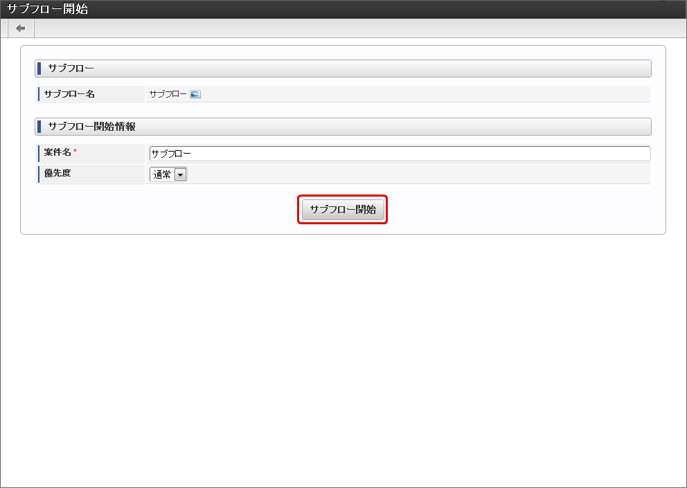 「サブフロー開始」画面で、「サブフロー開始情報」の「案件名」、「優先度」を設定し、「サブフロー開始」をクリックします。