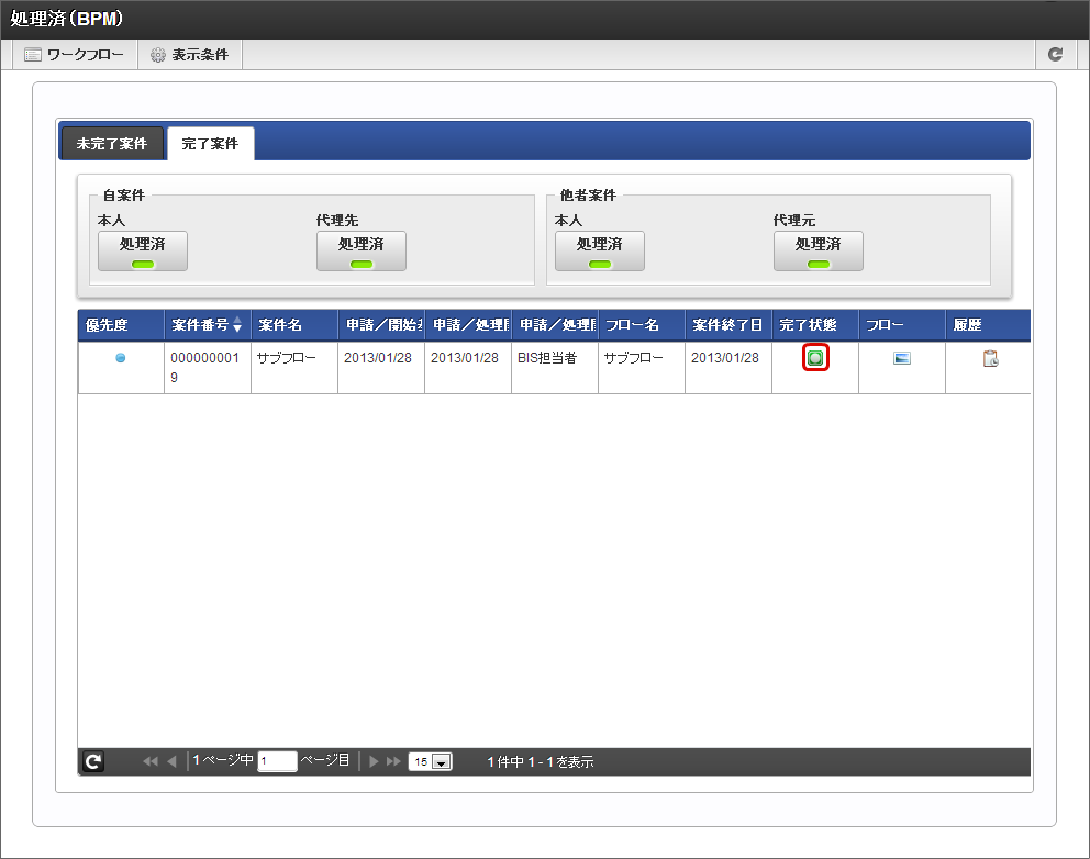 「サイトマップ」→「IM-BIS」→(BISフロー、またはワークフロー)→「処理済」をクリックします。処理済は、サブフローのBIS作成種類のものを選択してください。「処理済(ワークフロー)」、または「処理済(BISフロー)」画面でサブフローの案件が「完了」となっていることを確認します。