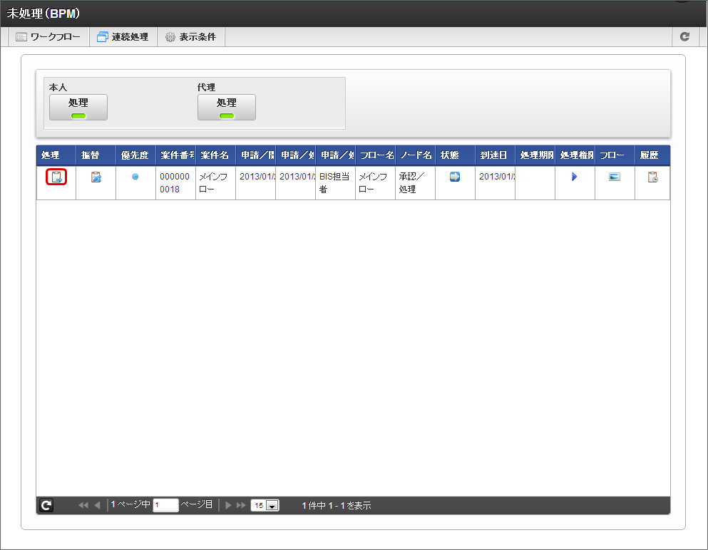 メインフローの承認/処理画面が表示されますので、「承認/処理」ボタンをクリックして、フローの処理を実行できます。