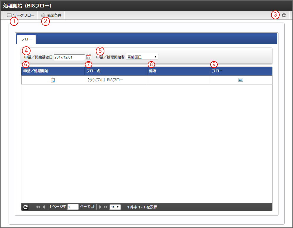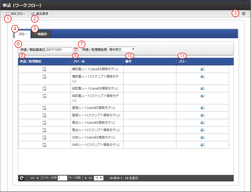 選択している「申請/開始基準日」「申請/処理開始者」の条件で申請できるフローの一覧を表示します。